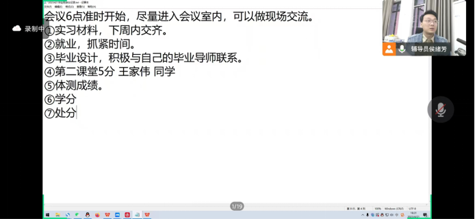 在会议中辅导员侯绪芳老师就及时上交实习材料、就业、毕业设计、第二课堂学分、体测、毕业所需学分以及处分这七个关于是否能够顺利毕业的问题依次向同学们解答,并在最后提问环节为同学们解答关于学分、补考以及网课等相关问题,在会议最后侯绪芳老师表示希望同学们能够顺利毕业,并找到理想的工作。