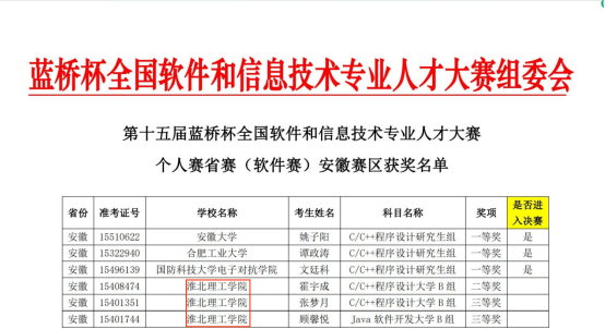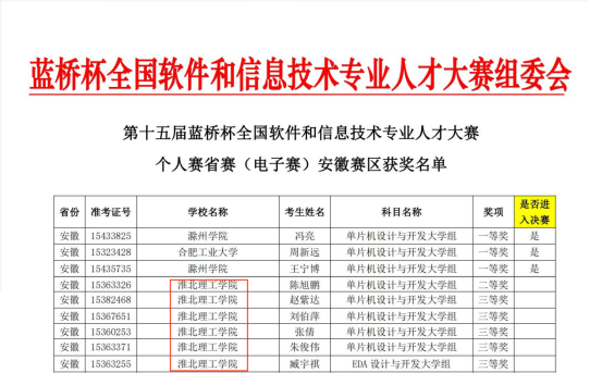 近日,第十五届蓝桥杯全国软件和信息技术专业人才大赛个人赛省赛安徽赛区圆满落幕。开云kaiyun体育开云kaiyun体育首次组织并筛选出17位学子参赛。其中4位参加软件赛的学子荣获省级大学B组二等奖1项和省级大学B组三等奖2项,13位参加电子赛的学子荣获省级大学生组二等奖1项和省级大学组三等奖5项。部分获奖名单如图所示: