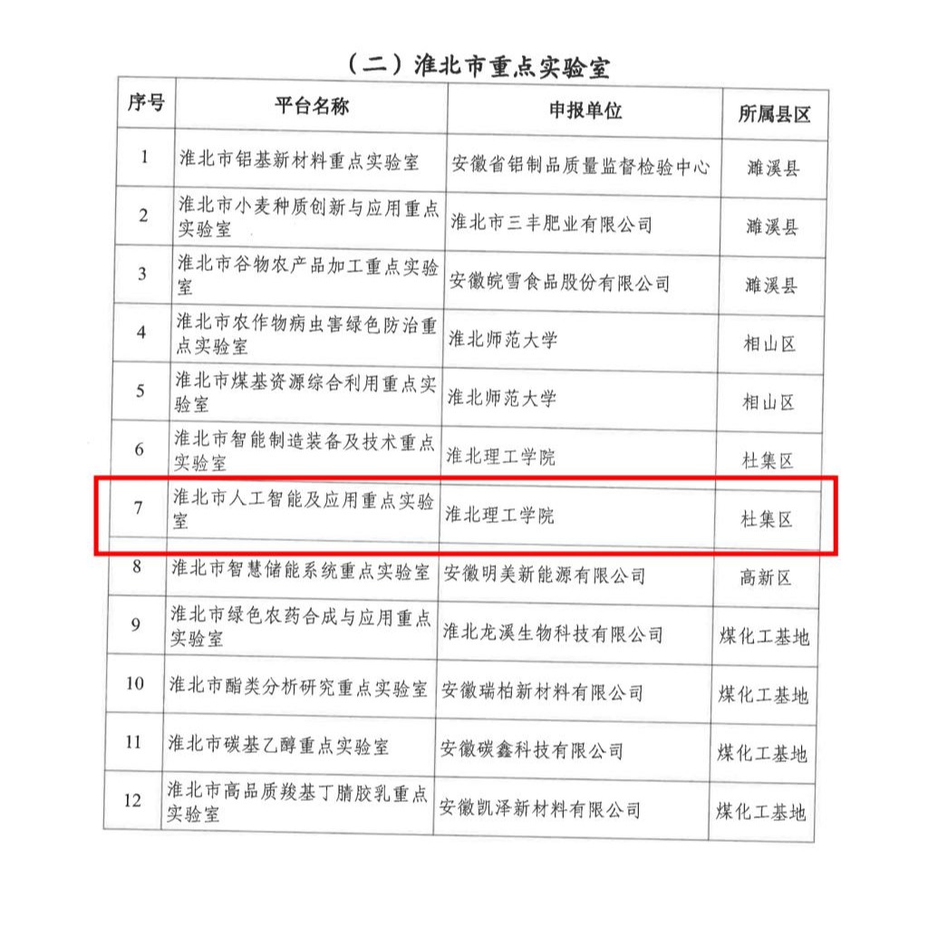 为进一步贯彻落实《关于加快推进科技创新平台建设的实施意见》(淮政办〔2023〕16号)精神,根据《关于印发<淮北市科技创新平台认定管理办法(试行)>和<淮北市科技创新平台绩效评价管理办法(试行)>的通知》(淮科〔2023〕16号)和《关于申报2024年度淮北市科技创新平台的通知》(淮科秘〔2024〕28号)文件精神,淮北市科技局经通知发布、组织申报、县区(园区)科技管理部门审核推荐、复核、专家评审、局党组会议研究同意、公示等程序,开云kaiyun体育开云kaiyun体育申报的“淮北市人工智能及应用重点实验室”,获批立项建设。