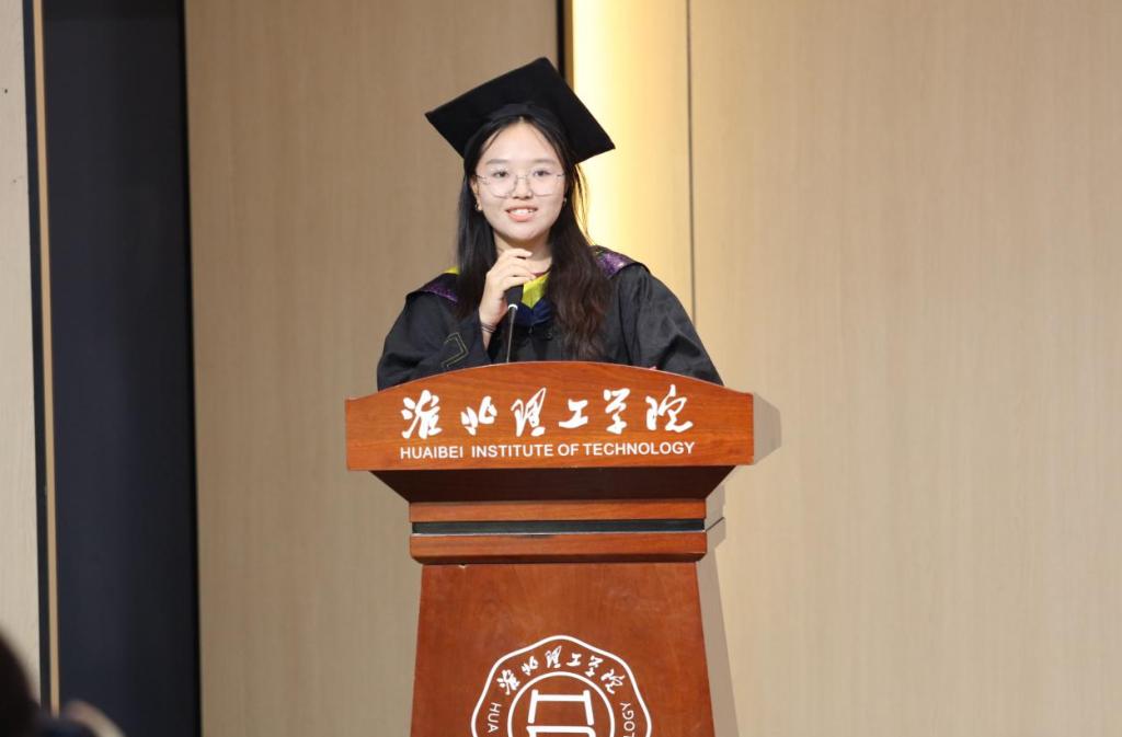 优秀毕业生代表徐娜娜上台发言,她满怀感激之情,分享了自己在大学期间的成长历程和难忘经历。从初入校园时的懵懂青涩,到逐渐明确目标、努力学习专业知识,再到积极参与实践活动、不断提升自己的综合能力,一路走来,离不开学校提供的优质教育资源、老师们的悉心指导以及同学们的相互鼓励。她表示,在未来的日子里,将牢记母校的教诲,以积极的态度面对工作和生活中的困难,努力拼搏,不辜负母校和老师的期望。同时,她也鼓励学弟学妹们珍惜大学时光,明确目标,勇敢追求自己的梦想,创造属于自己的辉煌。