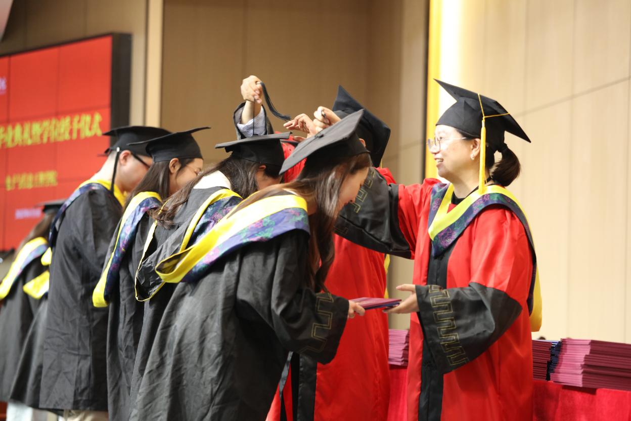 随后,在欢快的音乐声中,校领导和学院领导依次为毕业生代表颁发毕业证书和学位证书,并为毕业生拨流苏。拨穗这一传统仪式,象征着毕业生们学有所成,即将开启人生新的征程,现场气氛热烈而温馨,每一位毕业生脸上都洋溢着自豪与喜悦。