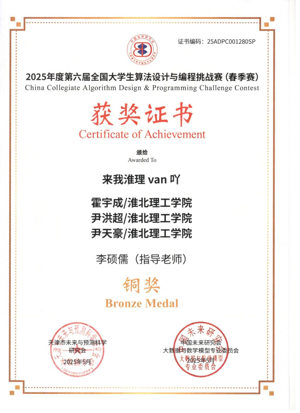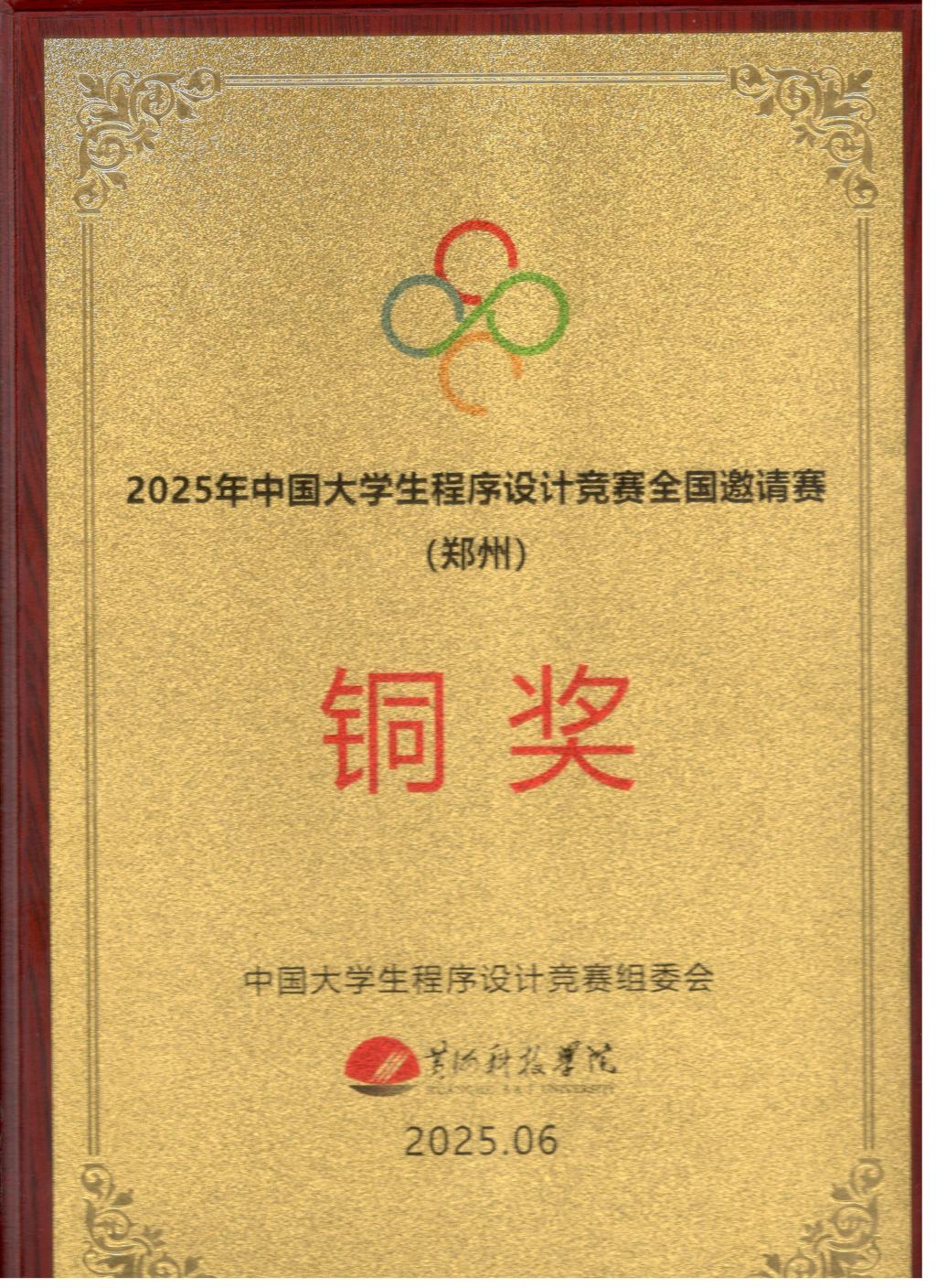 以赛促学强能力,算法竞技展锋芒。开云官网开云kaiyun体育学子凭借扎实专业功底,获2025年度第六届全国大学生算法设计与编程挑战赛(春季赛)全国铜奖、获2025年安徽省机器人大赛——程序设计赛道省级二等奖、获2025年中国大学生程序设计竞赛全国邀请赛(郑州)全国铜奖。