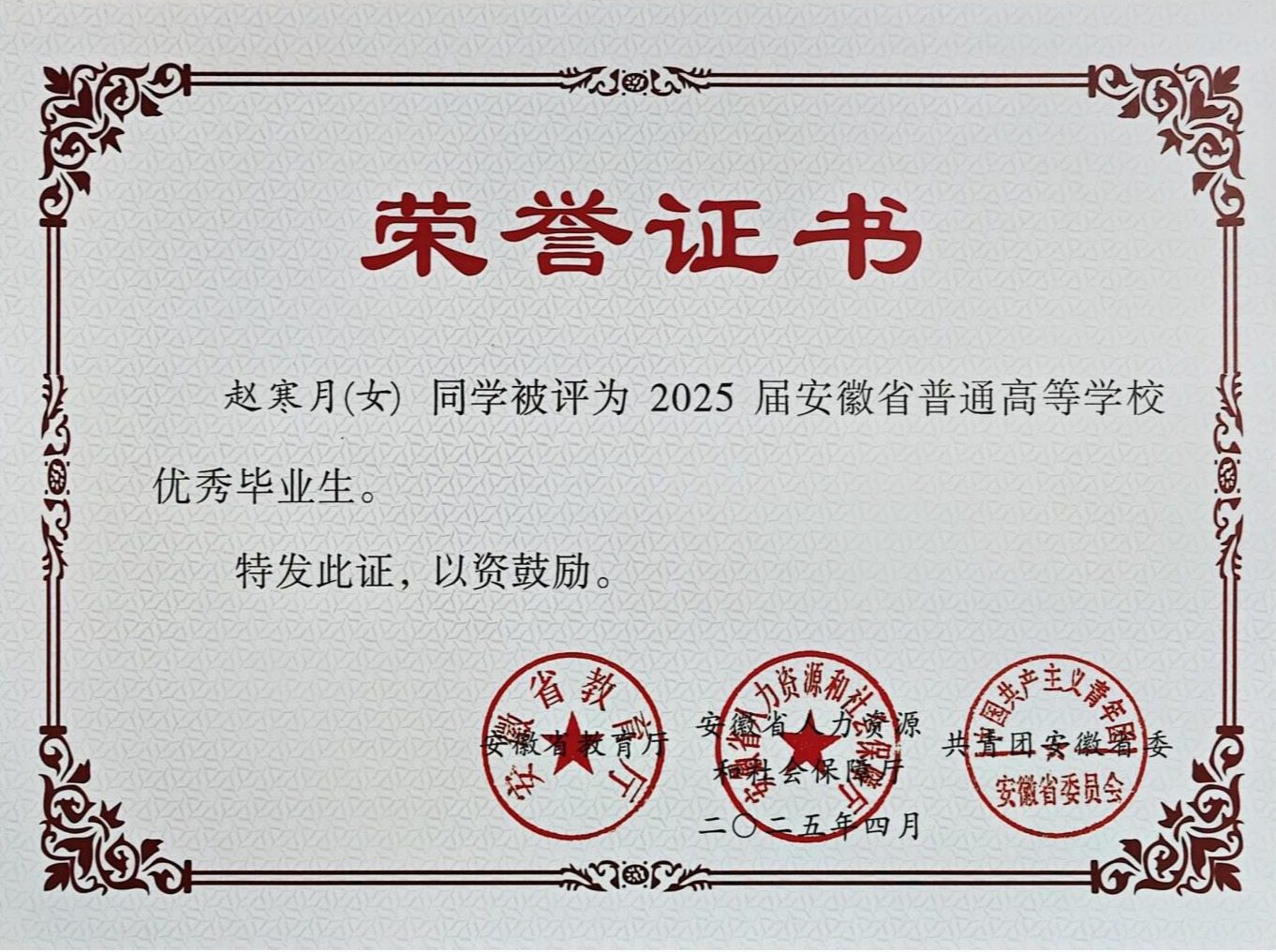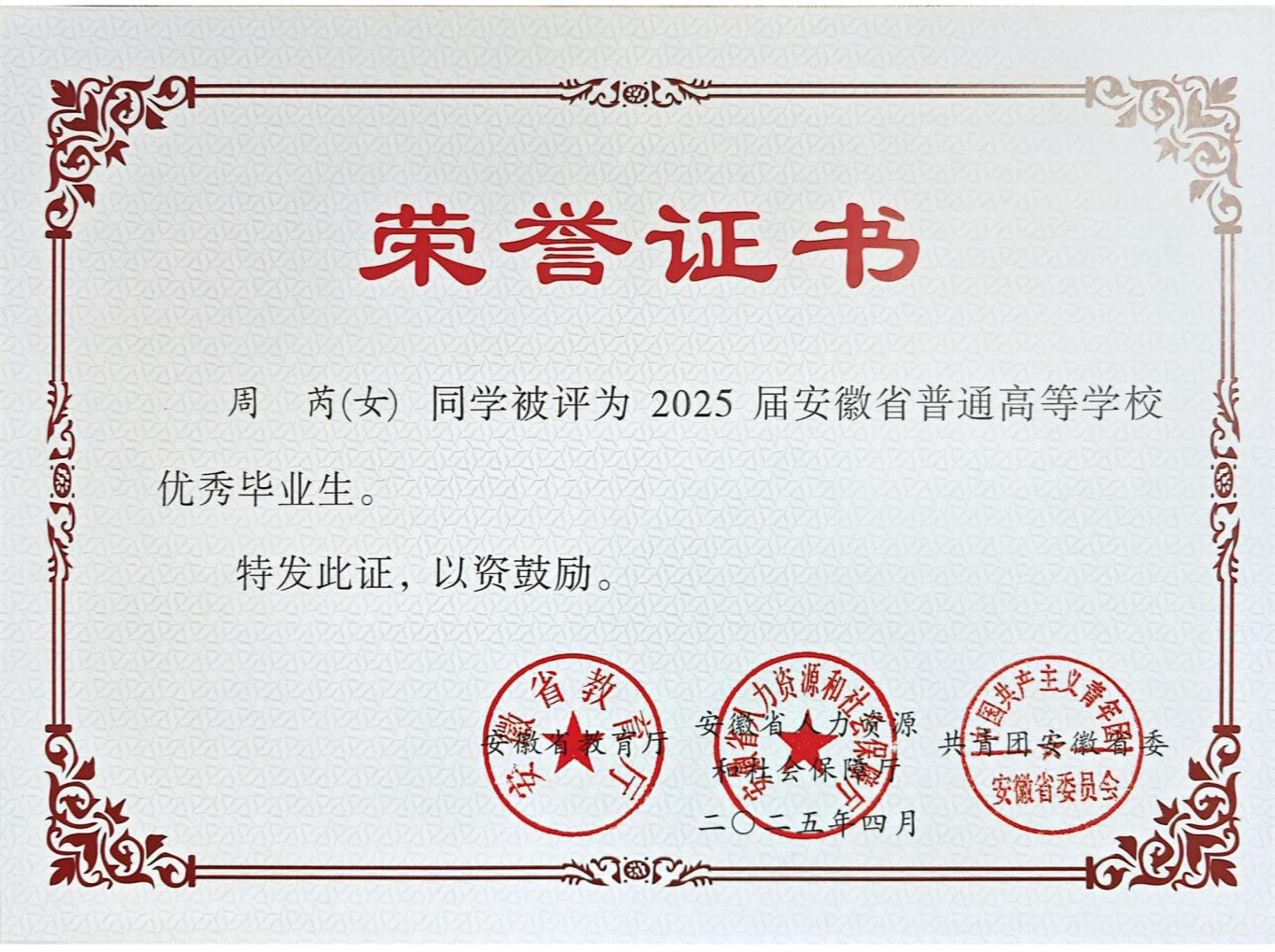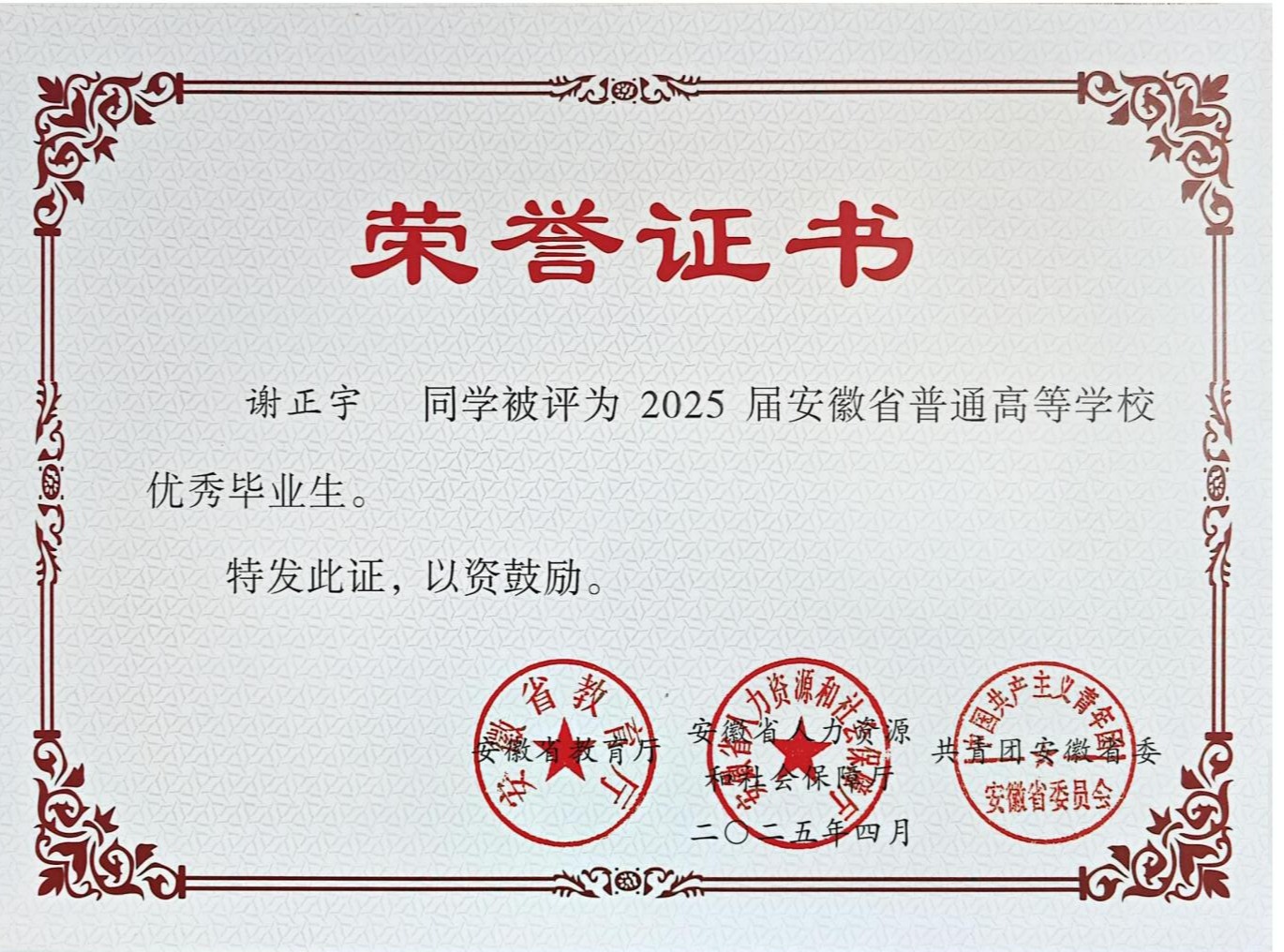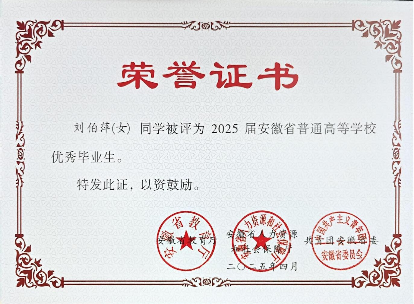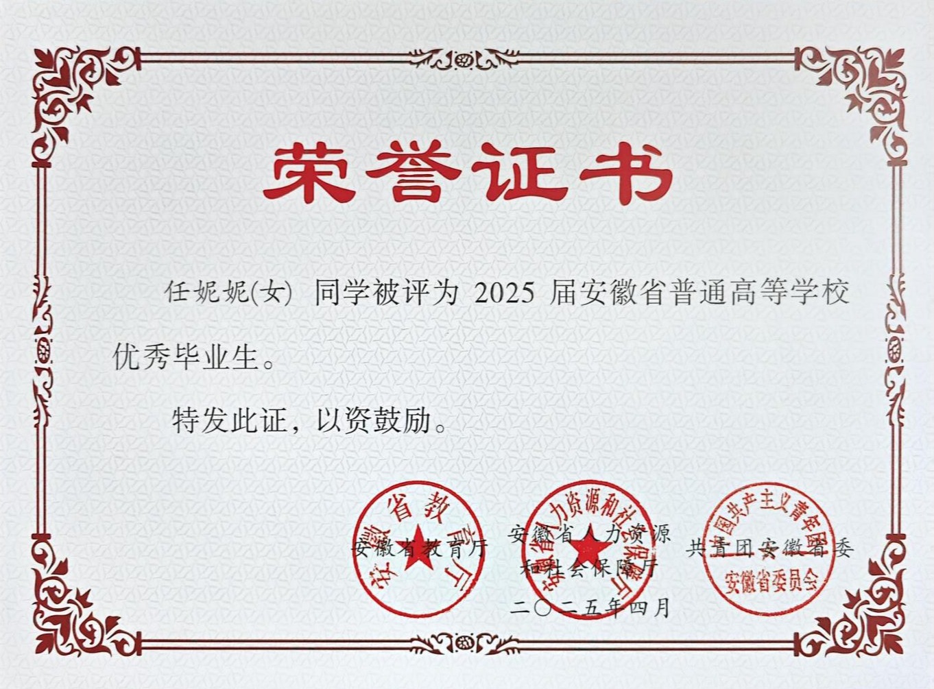 奖学金荣誉:曾获国家奖学金、国家励志奖学金、校级特等奖学金校级三好学生、优秀团员等。