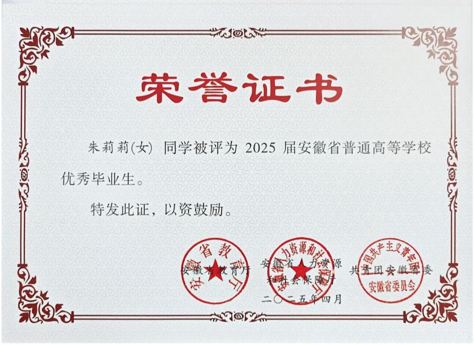 奖学金荣誉:曾获2021-2022学年校级三好学生、2021-2022学年校级特等奖学金、2021-2022学年校级优秀学生干部、2022-2023学年校级特等奖学金、2022-2023学年校级优秀学生干部、2023-2024学年校级三好学生、2023-2024学年校级特等奖学金、2025届校级优秀毕业生。