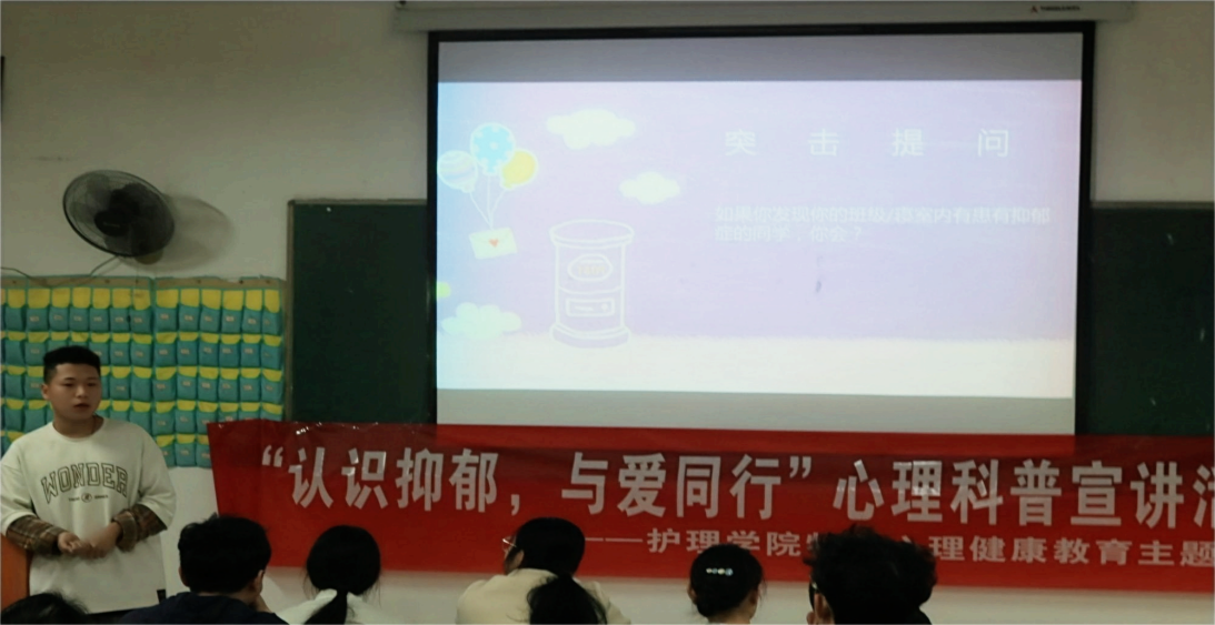 在宣讲过程中,主讲人通过深入浅出的讲解向参与者介绍了抑郁症的症状、成因以及治疗方法。主讲人强调,抑郁症是一种常见的心理疾病,生活压力、工作疲劳、人际关系等因素都可能导致抑郁症的发生,早期发现和干预对抑郁症患者的康复至关重要。在宣讲过程中还设置了互动环节,让参与者有机会提出问题、分享经验,进一步促进了同学们对抑郁症的了解和讨论。