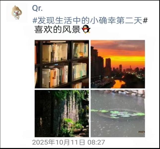 2025年10月10日至12日进行了线上活动,参加活动的同学纷纷用镜头和文字,在朋友圈里定格下属于自己的“小确幸”。这些细微而真实的美好,在分享中交织成一幅幅温暖的校园生活图景。打卡活动结束后,工作人员根据评选标准选取前400位打卡者发放奖品。