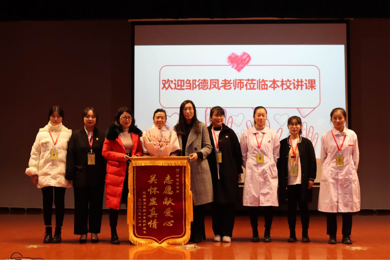 202011251600-1700于学院活动中心二楼报告厅观看第44届南丁格尔的获奖者江西红十字志愿护理服务中心副秘书长邹德凤老师开展以“疫情无情人有情,志愿服务显真情”为主题的讲座。本次讲座还邀请了李玉萍秘书长、曾莉斯助理、陈宝玲副主任以及学院全体学生志愿者和青年志愿协会成员。