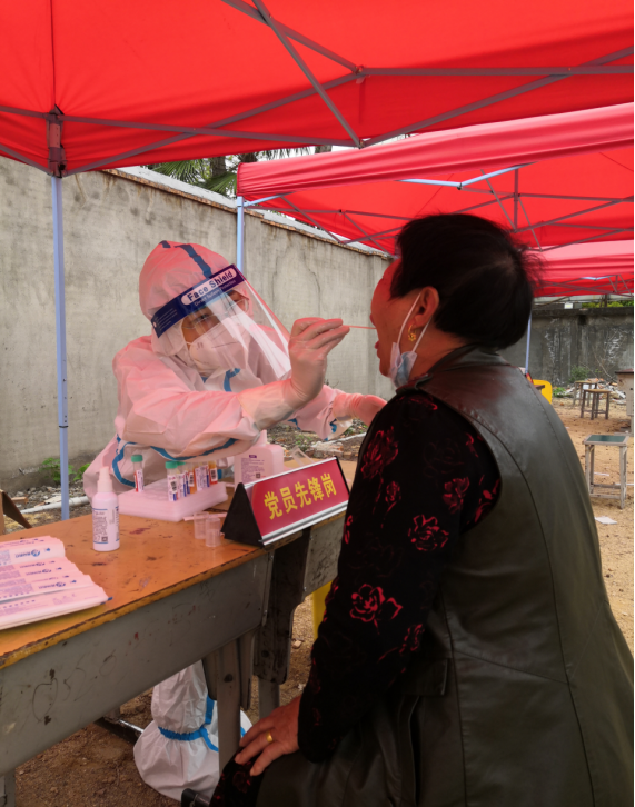 助产系妇产科专职教师赖文娟老师,家中上有老下有小需要照顾,两个小朋友都在家上网课,老二支气管肺炎在家雾化治疗。但在得知招募防疫工作志愿者的消息后,赖老师第一时间报名参加,支援八一乡核酸检测采样。
