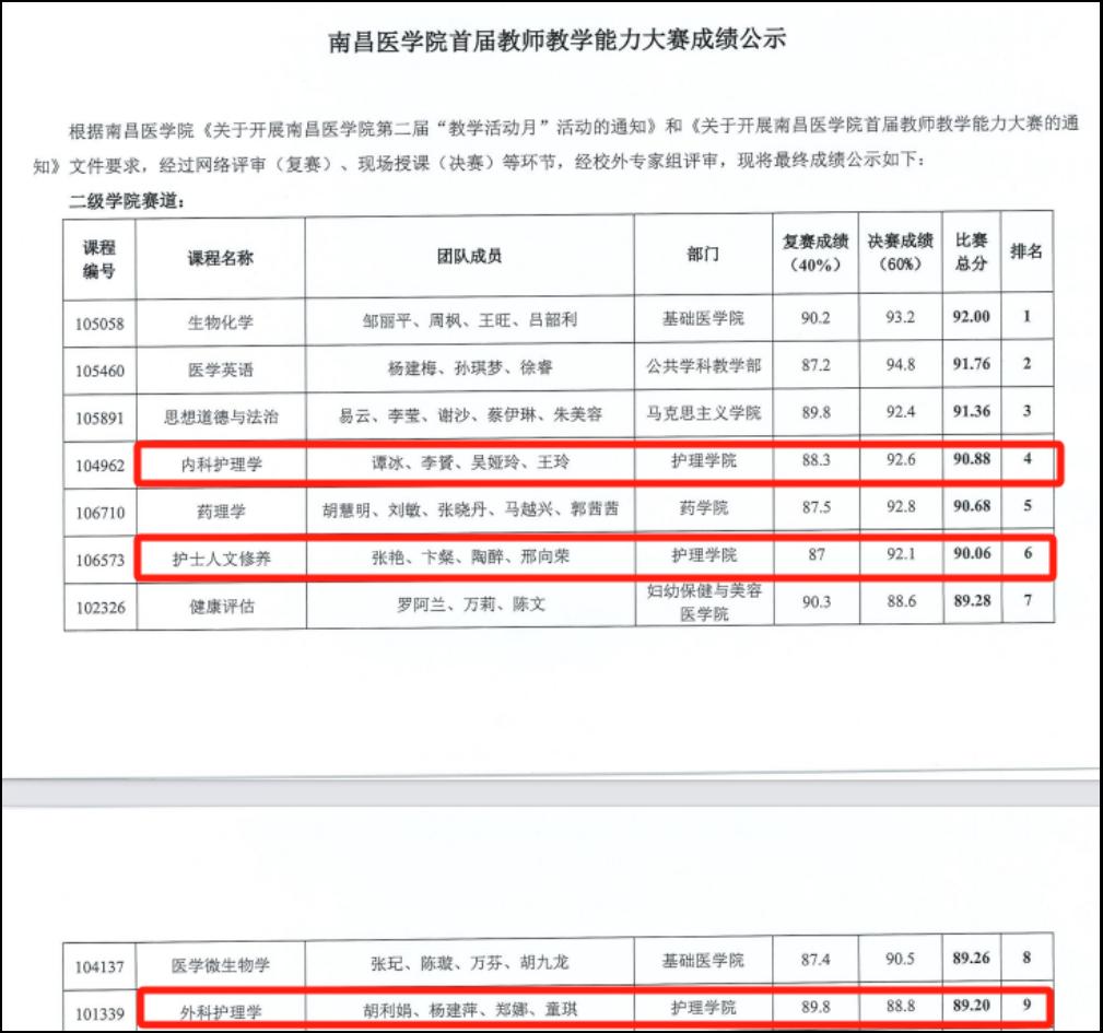 在首届教师教学能力大赛中,sunbet申搏官方网站谭冰等老师的《内科护理学》课程团队、张艳等老师的《护士人文修养》课程团队、胡利娟等老师的《外科护理学》课程团队分别取得第四名、第六名和第九名的佳绩。