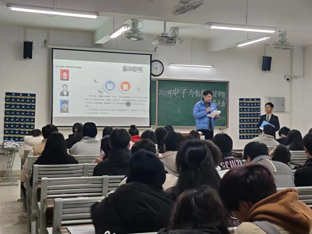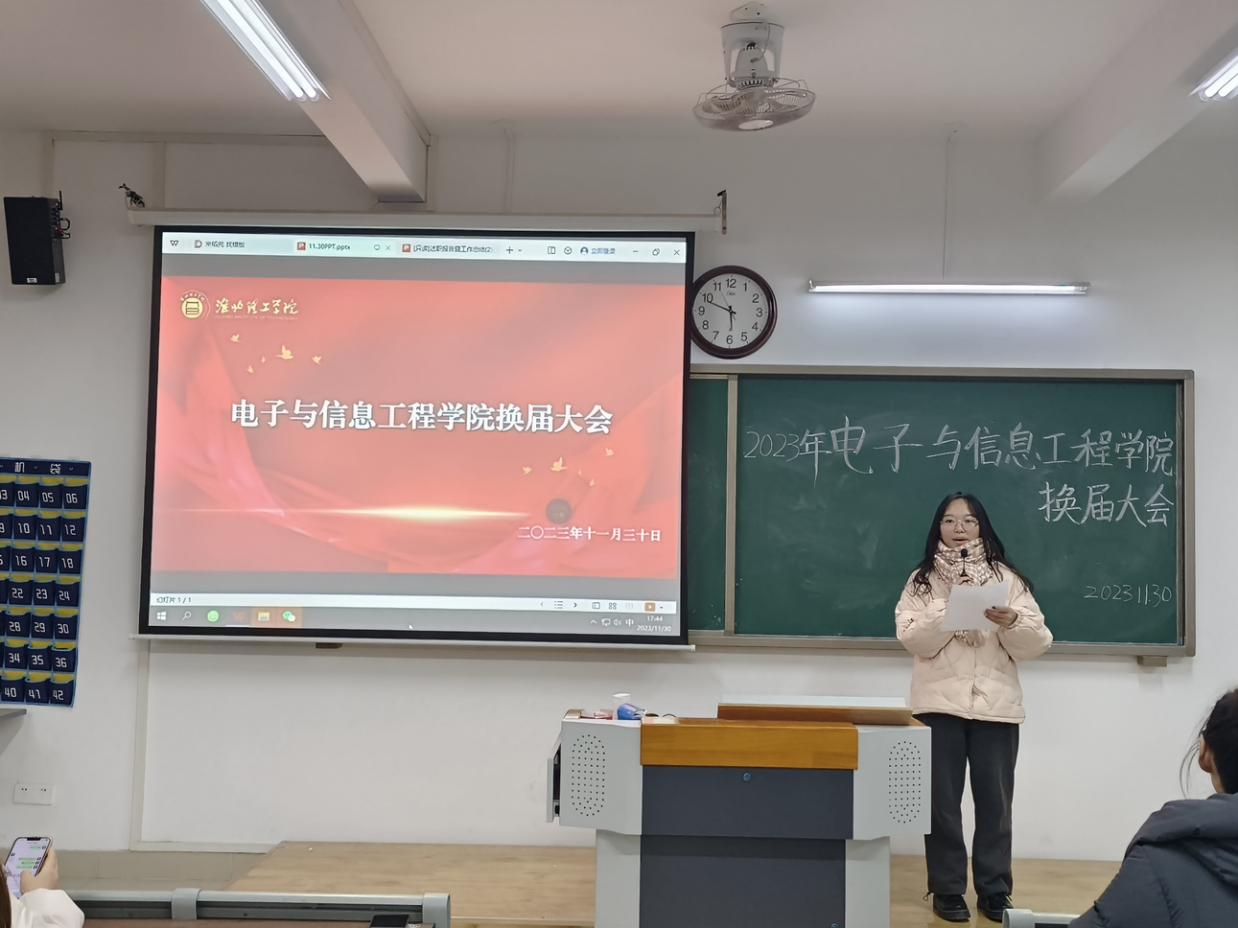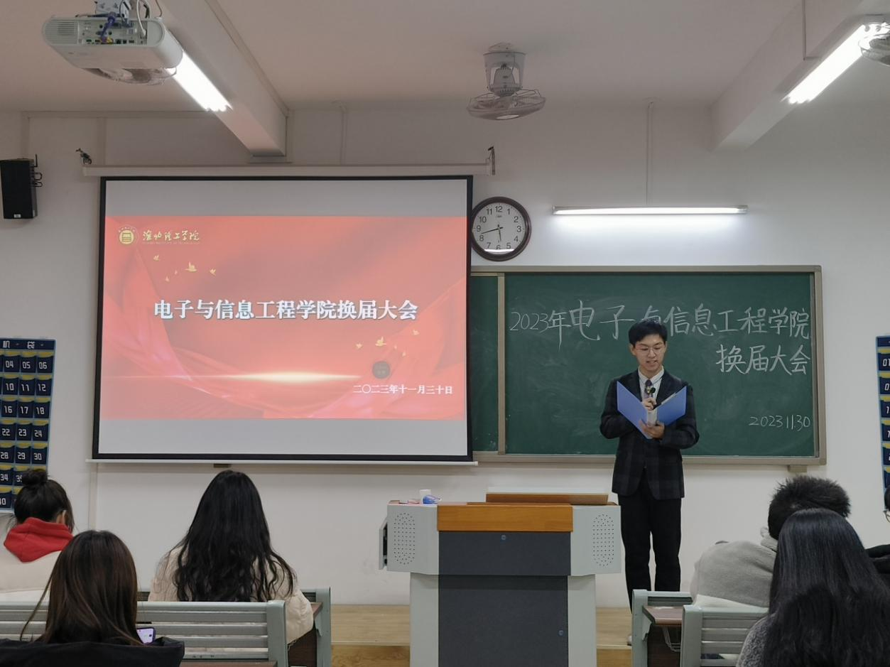 2023年11月29日17:30,开云kaiyun体育学生会换届大会在第一教学楼405教室举行。电信学院学生会主席梅毅松、副主席朱昊、副主席陈可怡、新主席徐娜娜同学以及学生会新老干部出席本次会议。本次换届大会的主持人是宇文昕羽。