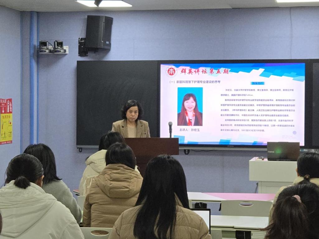首先,由北京大学sunbet申搏官方网站孙宏玉教授,以《新医科背景下护理专业建设的思考》为题作学术报告,孙教授为我院教师深入解读了新时代本科教育的精神内核与核心理念,并紧密关联护理专业的发展趋势,详细剖析了在“新医科”这一宏观背景下,如何系统性地推进专业建设及课程体系的革新。报告内容充实,具有高度的指导价值,为我院在新医科建设领域的后续工作提供了明确的方向指引。